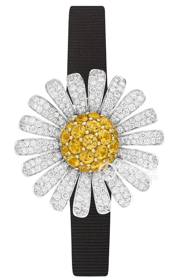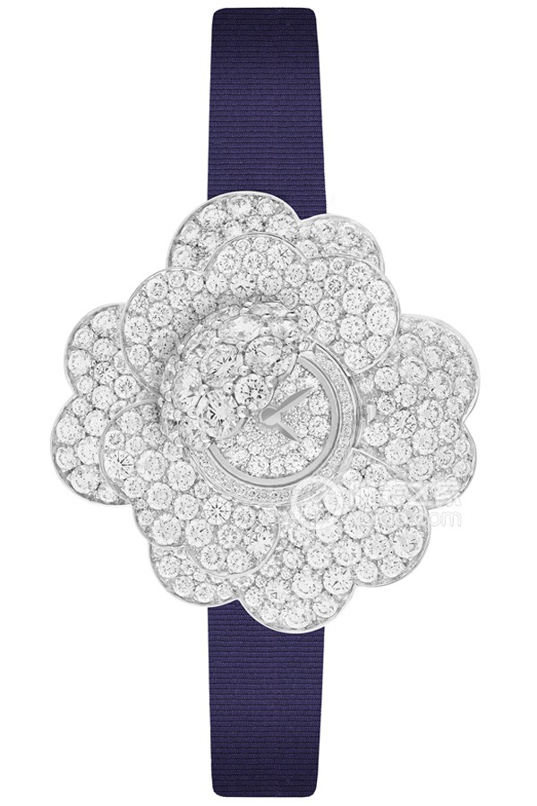 Van Cleef & Arpels High Jewelry Watch VCARO8SP00 Quartz, 18k white gold petals set with round diamonds; yellow gold case back set with round yellow sapphires, 12mm.