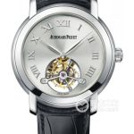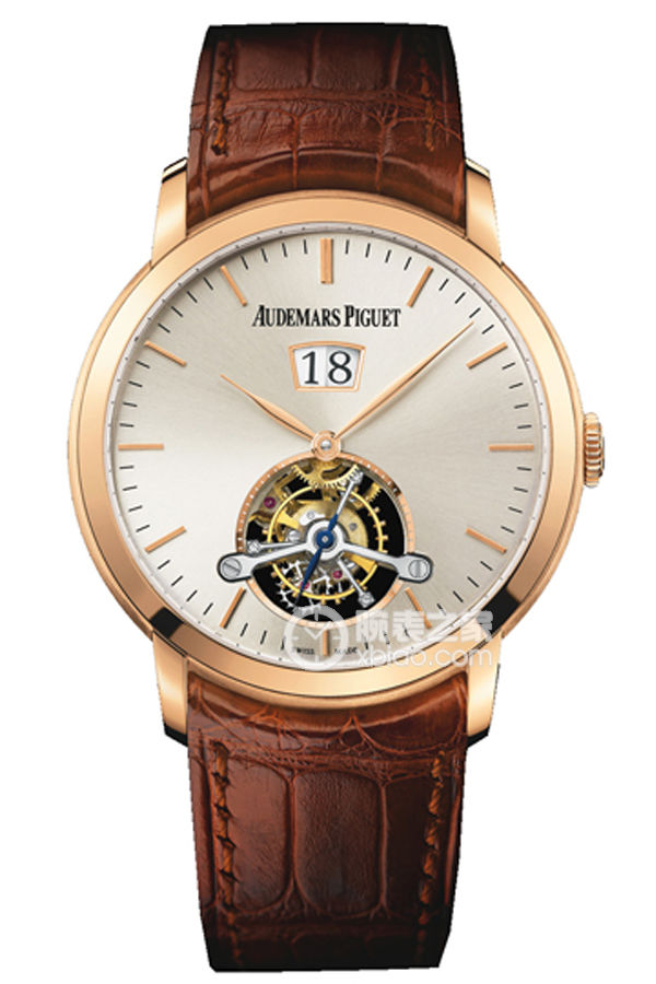 Basic Information: ID: 26559OR.OO.D088CR.01; Brand: Audemars Piguet; Series: Jules Audemars; Gender: Men; Movement: CAL.2909; Manufacturer: Unknown; Movement Diameter: 33mm; Frequency: 21,600 vibrations per hour; Hairspring: Breguet; Jewels: 19; Parts: 228; Power Reserve: 72 hours; Appearance: Case Diameter: 41mm; Case Thickness: 10.65mm; Dial Color: Silver-white; Dial Shape: Round; Strap Color: Brown; Clasp Type: Folding Clasp; Case Back: Transparent; Weight: Not available; Water Resistance: 20 meters; Hour Marker Type: Bat; Clasp Spacing: Not available; Lug Spacing: Not available; Materials: Case Material: 18k Rose Gold; Dial Material: Rose Gold; Applied Hour Markers; Bezel Material: 18k Rose Gold; Crystal Material: Sapphire Crystal; Crown Material: 18k Rose Gold; Strap Material: Alligator Leather; Clasp Material: 18k Rose Gold; Functions: Date Display, Tourbillon