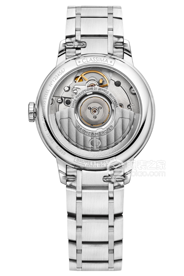 Basic Information: ID: MOA10553; Brand: Baume & Mercier; Series: Classima; Movement Type: Automatic; Gender: Ladies; Movement Model: ETA 2892-A2; Manufacturer: ETA; Movement Diameter: 25.6 mm; Movement Thickness: 3.6 mm; Frequency: 28,800 vibrations per hour; Hairspring: Flat; Jewels: 21; Power Reserve: 42 hours; Case Diameter: 31 mm; Case Thickness: 8.25 mm; Dial Color: White; Dial Shape: Round; Strap Color: Silver; Clasp Type: Folding Clasp; Case Back: Transparent; Weight: Not available; Water Resistance: 50 meters; Hour Markers: Diamond-set; Hour Markers: Roman Numerals; Clasp Spacing: Not available; Lug Spacing: Not available; Materials: Case Material: Stainless Steel; Dial Material: Not available; Bezel Material: Stainless Steel; Crystal Material: Sapphire Crystal; Crown Material: Stainless Steel; Strap Material: Stainless Steel; Clasp Material: Stainless Steel; Functions: Date Display