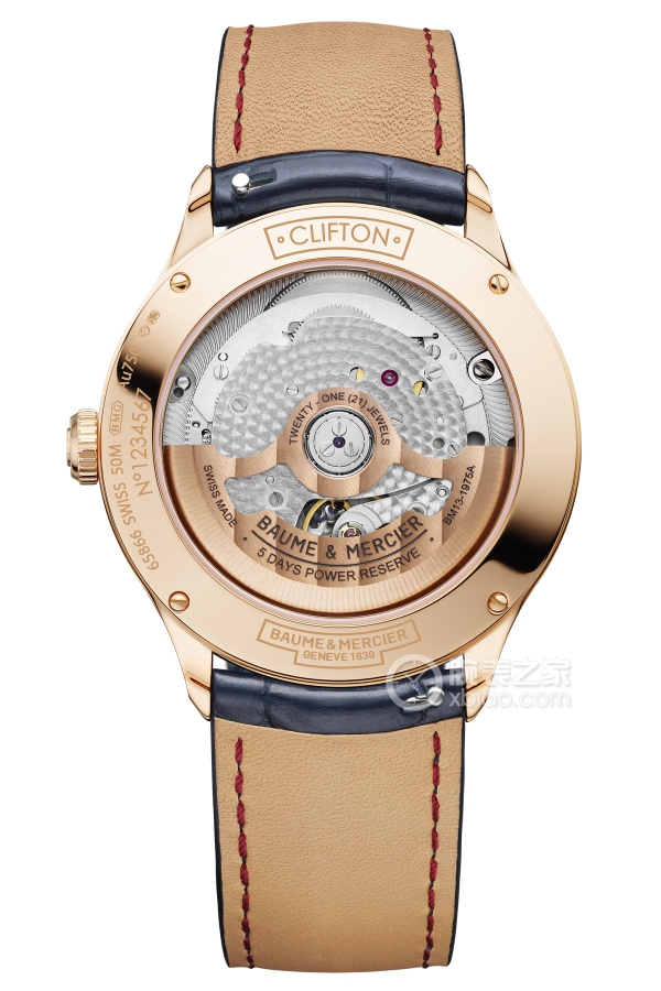 Basic Information: ID: MOA10584; Brand: Baume & Mercier; Series: Clifton; Movement Type: Automatic; Gender: Men’s; Movement Model: BM13-1975A; Movement Type: Automatic; Manufacturer: Unknown; Movement Thickness: 4.25 mm; Frequency: 28,800 vibrations per hour; Number of Jewels: 21; Power Reserve: 120 hours; Technical Certification: Swiss Official Chronometer Testing Institute (COSC); Appearance: Case Diameter: 39 mm; Case Thickness: 10.74 mm; Dial Color: Gradient Grey; Dial Shape: Round; Strap Color: Blue; Buckle Type: Pin Buckle; Case Back: Transparent; Weight: Not Available; Water Resistance: 50 meters; Hour Marker Type: Bat; Buckle Spacing: Not Available; Lug Spacing: Not Available; Materials: Case Material: 18k Rose Gold; Dial Material: Lacquered Gradient Grey Dial with White Cross Pattern in the Center; Gold-plated Riveted Faceted Long Trapezoidal Markers and Alpha Hands; Bezel Material: 18k Rose Gold; Crystal Material: Anti-reflective (Double-sided) Scratch-resistant Domed Sapphire Crystal; Crown Material: 18k Rose Gold Rose gold crown, square-scale alligator leather strap, gold-plated buckle, date display.