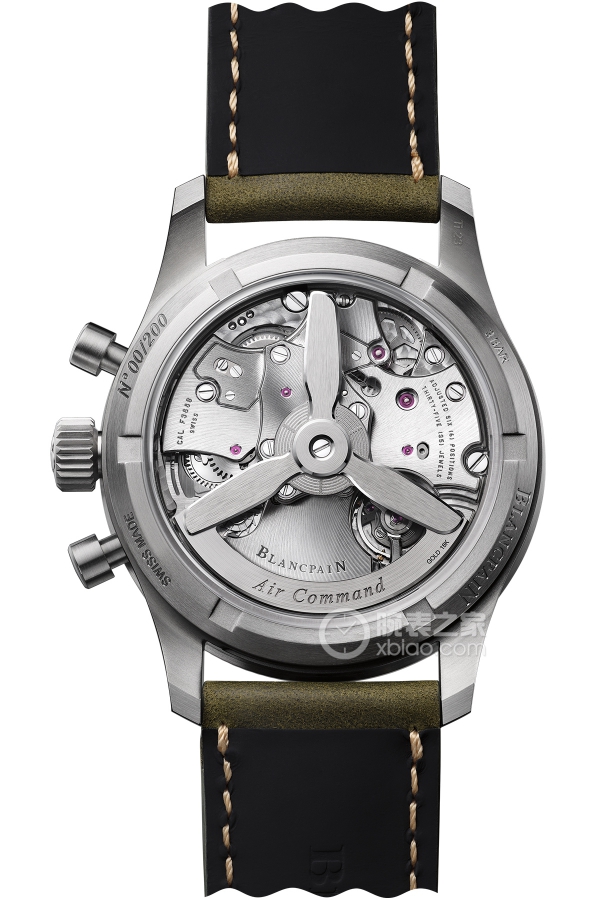 Basic Information: ID: AC02-12B53-63B; Brand: Blancpain; Series: Air Force Commander; Gender: Men’s; Limited Edition: 200; Movement: Movement Model: F388B; Manufacturer: Blancpain; Movement Diameter: 31.80 mm; Movement Thickness: 6.65 mm; Frequency: 36,000 vibrations per hour; Jewels: 35; Parts: 293; Power Reserve: 50 hours; Case Diameter: 42.5 mm; Case Thickness: 13.77 mm; Dial Color: Green; Dial Shape: Round; Strap Color: Green; Clasp Type: Folding Clasp; Case Back: Transparent; Weight: Not available; Water Resistance: 30 meters; Hour Markers: Arabic numerals; Clasp Spacing: Not available; Lug Spacing: 22mm; Materials: Case Material: Titanium; Dial Material: Not available; Bezel Material: Ceramic; Crystal Material: Sapphire Crystal; Crown Material: Titanium; Strap Material: Leather; Clasp Material: Titanium; Functions: Chronograph, Flyback/Retrograde