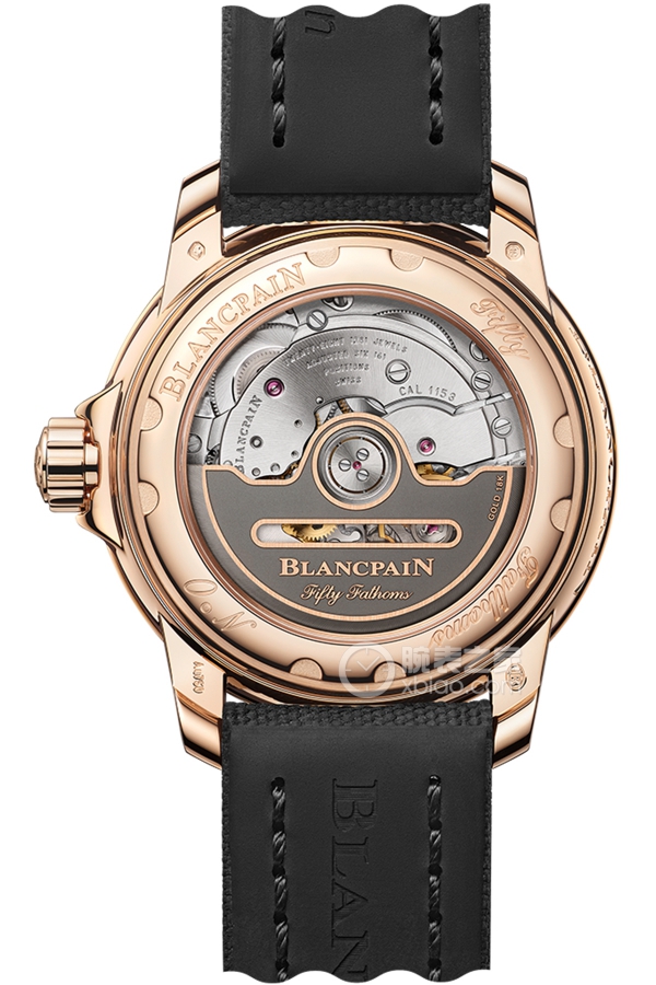 Basic Information Number: 5007-3644A-B52B Brand: Blancpain Series: Fifty Fathoms Movement Type: Automatic Mechanical Gender: Ladies Movement Model: Cal.1153 Movement Type: Automatic Mechanical Manufacturer: Blancpain Movement Diameter: 26.2 mm Movement Thickness: 3.25 mm Frequency: 21,600 vibrations per hour Number of Jewels: 28 Number of Parts: 186 Power Reserve: 100 hours Exterior Case Diameter: 38.2 mm Case Thickness: 12 mm Dial Color: White Dial Shape: Round Strap Color: Black Clasp Type: Folding Clasp Case Back: Transparent Weight: Not available Water Resistance: 300 meters Hour Marker Type: Luminous Hour Markers Clasp Spacing: Not available Lug Spacing: 19 mm Materials Case Material: 18k Red Gold Dial Material: Mother-of-Pearl Bezel Material: Sapphire Crystal Material: Sapphire Crystal Glass Crown Material: 18k Red Gold Strap Material: Canvas Clasp Material: 18k Rose Gold Functions: This watch has no other special functions.