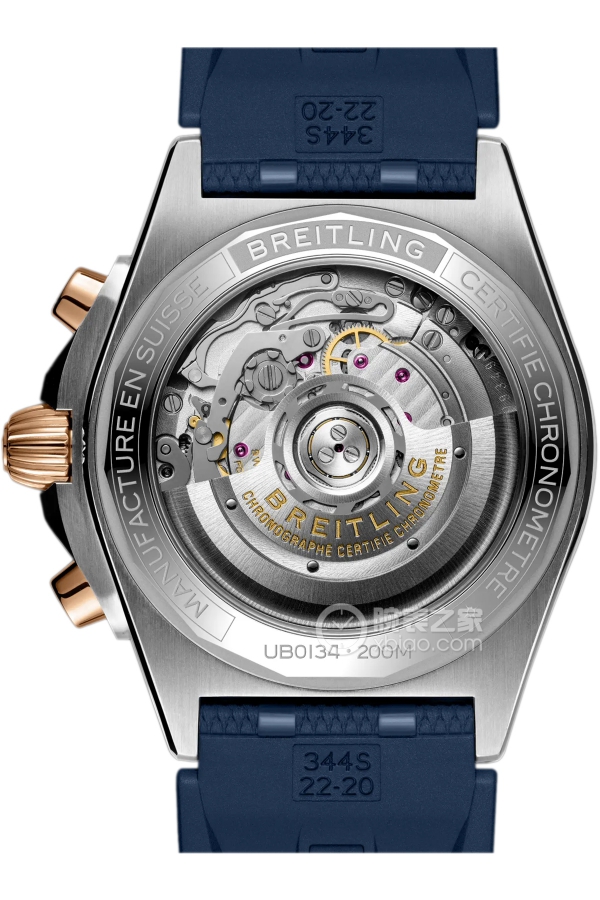 Basic Information Number UB0134101C1S1 Brand Breitling Series Mechanical Chronograph Movement Type Automatic Mechanical Gender Men’s Movement Movement Model B01 Movement Type Automatic Mechanical Manufacturer Breitling Movement Diameter 30mm Movement Thickness 7.2mm Frequency 28,800 vibrations per hour Number of Jewels 47 Number of Parts 346 Power Reserve 70 hours Technical Certification Swiss Observatory Appearance Case Diameter: 42mm Case Thickness: 15.1mm Dial Color: Blue Dial Shape: Round Strap Color: Blue Clasp Type: Folding Clasp Case Back: Transparent Weight: 152.94g Water Resistance: 200 meters Hour Marker Type: Bat Hour Markers Clasp Spacing: 20mm Lug Spacing: 22mm Materials Case Material Stainless Steel Dial Material Not Available Bezel Material Rose Gold Crystal Material Sapphire Crystal Glass Crown Material Rose Gold Strap Material Rubber Clasp Material Stainless Steel Functions Date Display Chronograph