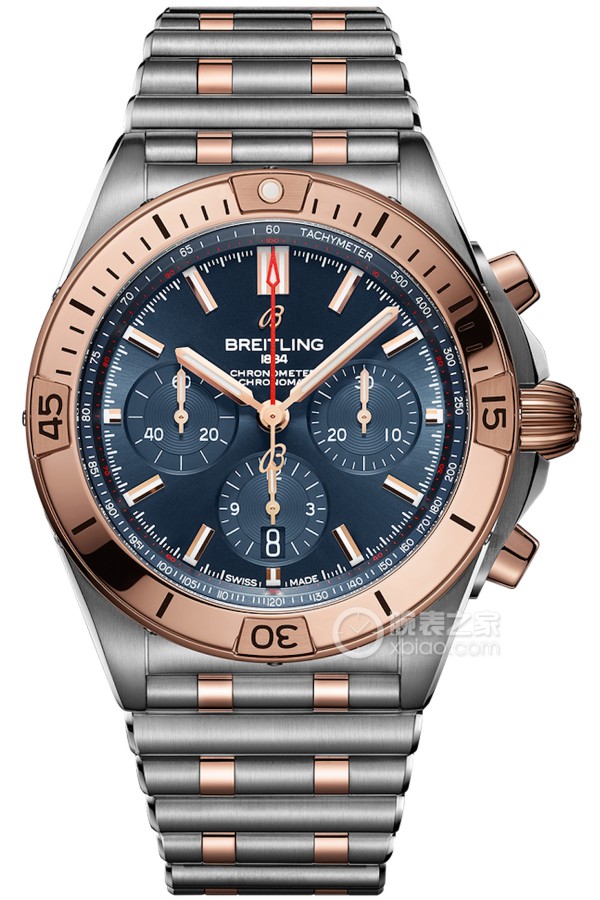 Basic Information: Model Number UB0134101C1U1; Brand: Breitling; Series: Mechanical Chronograph; Movement Type: Automatic; Gender: Men’s; Movement Model: Cal.01; Manufacturer: Breitling; Movement Diameter: 30mm; Movement Thickness: 7.2mm; Frequency: 28,800 vibrations per hour; Number of Jewels: 40/34/41; Number of Parts: 346/336/334; Power Reserve: 70 hours; Technical Certification: Swiss Official Chronometer Testing Institute (COSC); Exterior: Case Diameter: 42mm; Case Thickness: 15.1mm; Dial Color: Blue; Dial Shape: Round; Strap Color: Two-tone; Clasp Type: Folding Clasp; Case Back: Screw-down (Sapphire Crystal Glass) Weight: 180.0 grams (excluding strap) Water Resistance: 200 meters Hour Marker Type: Bat-shaped Luminous Clasp Spacing: Not available Lug Spacing: 22/20 mm Materials: Case Material: Stainless Steel Dial Material: Not available Bezel Material: 18K Red Gold, Roach-driven unidirectional bezel Crystal Material: Domed Sapphire Crystal, Double Anti-reflective Crown Material: Screw-down, Double Gasket Strap Material: Stainless Steel/18K Red Gold Clasp Material: Stainless Steel Functions: Date Display, Chronograph