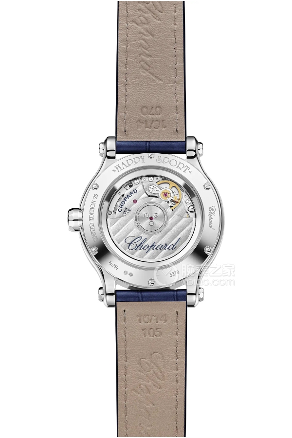Basic Information Number: 275378-1003; Brand: Chopard; Series: HAPPY SPORT; Movement Type: Automatic Mechanical; Gender: Women’s; Limited Edition: 25; Movement Model: CHOPARD 09.01-C Movement Type: Automatic Mechanical; Manufacturer: Chopard; Movement Diameter: 20.40 mm; Movement Thickness: 3.65 mm; Balance Wheel with Three Spokes; Frequency: 25,200 vibrations per hour; Hairspring: Flat-coiled; Jewels: 27; Parts: 148; Power Reserve: 42 hours; Case Diameter: 36 mm; Case Thickness: 10.99 mm; Dial Color: Blue; Dial Shape: Round; Strap Color: Blue; Buckle Type: Pin Buckle; Case Back: Transparent; Weight: Not available; Water Resistance: 30 meters; Hour Marker Type: Bat; Buckle Spacing: Not available; Lug Spacing: Not available; Materials: Case Material: 18k White Gold; Dial Material: Aventurine Glass; Bezel Material: 18k White Gold with Diamonds; Crystal Material: Sapphire Crystal; Crown Material: 18k White Gold; Strap Material: Alligator Leather; Buckle Material: 18k White Gold; Functions: This watch has no other special functions.
