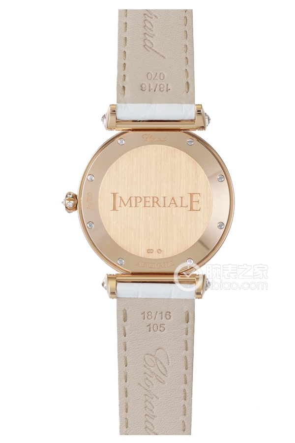 Basic Information Number 384242-5021 Brand Chopard Series IMPERIALE Movement Type Automatic Mechanical Gender Ladies Movement Type Automatic Mechanical Basic Movement Cal.SW300 Movement Diameter 26.2 mm Frequency 28,800 vibrations per hour Number of Jewels 25 Power Reserve 42 hours Appearance Case Diameter: 36 mm Case Thickness: 9.3 mm Dial Color: White Dial Shape: Round Strap Color: White Clasp Type: Pin Buckle Case Back: Solid Weight: Not available Water Resistance: 50 meters Hour Marker Type: Bat-shaped Hour Markers Roman Numerals Clasp Spacing: Not available Lug Spacing: Not available Materials Case Material 18k Rose Gold Dial Material Mother-of-Pearl Bezel Material Set with Colored Sapphire Crystal Material Anti-reflective Sapphire Crystal Crown Material 18k Rose Gold Strap Material Alligator Leather Clasp Material 18k Rose Gold Functions This watch has no other special functions.