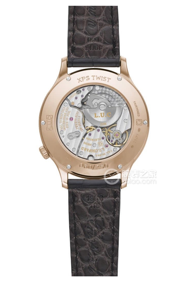 Basic Information: ID: 161945-5001; Brand: Chopard; Series: LUC; Movement Type: Automatic Mechanical; Gender: Men’s; Limited Edition: 250; Movement Model: LUC 96.09-L Movement Type: Automatic Mechanical; Manufacturer: Chopard; Movement Diameter: 27.4 mm; Movement Thickness: 3.3 mm; Balance Wheel: 22K gold micro-rotor conforming to Chopard’s sustainability and social responsibility philosophy; Frequency: 28,800 vibrations per hour; Hairspring: Flat with curved ends; Number of Jewels: 29; Number of Parts: 172; Power Reserve: 65 hours; Technical Certification: Swiss Official Chronometer Testing Institute (COSC); Appearance: Case Diameter: 40 mm; Case Thickness: 7.20 mm; Dial Color: Dark Grey; Dial Shape: Round; Strap Color: Black; Buckle Type: Pin Buckle; Case Back: Transparent; Weight: Not available; Water Resistance: 30 meters; Hour Marker Type: Tapered; Buckle Spacing: Not available; Lug Spacing: Not available; Materials: Case Material: 18k Rose Gold; Dial Material: Dark Grey; Electroplated; Grated Dial; Gold-plated Dauphine Hour and Minute Hands; Gold-plated Batton Small Seconds; Bezel Material: 18k Rose Gold; Crystal Material: Anti-reflective Sapphire Crystal; Crown Material: 18k Rose Gold; Strap Material: Alligator Leather; Buckle Material: 18k Rose Gold; Functions: This watch has no other special functions.