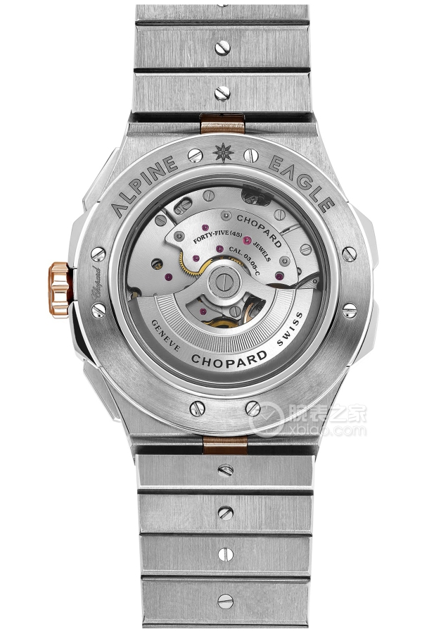 Basic Information Number: 298609-6001; Brand: Chopard; Series: Alpine; Movement Type: Automatic Mechanical; Gender: Men’s; Movement Model: Chopard 03.05-C Movement Type: Automatic Mechanical; Manufacturer: Chopard; Movement Diameter: 28.80 mm; Movement Thickness: 7.60 mm; Balance Wheel with Four Spokes, Micro-Regulator with Screws; Frequency: 28,800 vibrations per hour; Hairspring: Flat-coated; Jewels: 45; Parts: 310; Power Reserve: 60 hours; Technical Certification: Swiss Official Chronometer Testing Institute (COSC); Appearance: Case Diameter: 44 mm; Case Thickness: 13.15 mm; Dial Color: Deep Black; Dial Shape: Round; Strap Color: Two-tone; Clasp Type: Folding Clasp; Case Back: Transparent; Weight: Not Available; Water Resistance: 100 meters; Hour Markers: Bat; Luminous Count: Not Available; Clasp Spacing: Not Available; Lug Spacing: Not Available; Materials: Case Material: Stainless Steel; Dial Material: Brass; Dial is electroplated and embossed with a sunburst pattern inspired by the iris of an eagle’s eye; Inlaid hour and numerals, gold-plated and coated with Super-LumiNova® Grade X1 luminescent material; Bat-shaped hour and minute hands, gold-plated and coated with Super-LumiNova® Grade X1 luminescent material. X1 luminescent coating; gold-plated arrow-tipped seconds hand with eagle feather-shaped weights; gold-plated chronograph hands with red bezels; 18k rose gold case; anti-reflective sapphire crystal; 18k rose gold crown with screw-down design; stainless steel/18k rose gold bracelet with two-tone buckle; functions include date display, chronograph flyback/retrograde.
