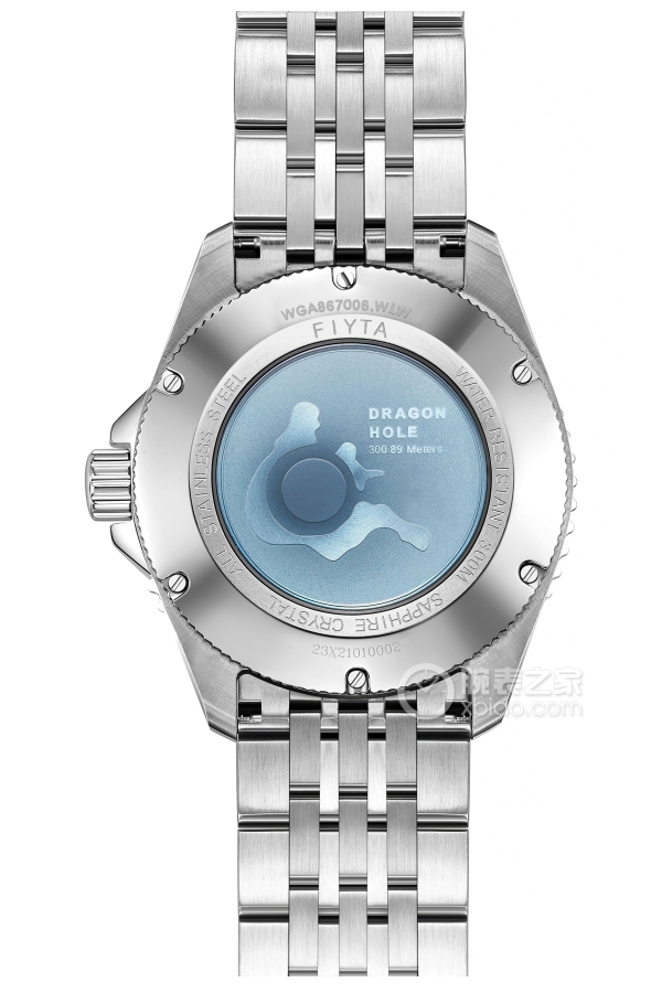Basic Information ID: WGA867006.WLW Brand: Fiyta Series: Ocean-themed Movement Type: Automatic Mechanical Gender: Men’s Movement Type: Automatic Mechanical Power Reserve: 42 hours Appearance: Case Diameter: 43.4 mm Case Thickness: 13.9 mm Dial Color: Ocean Blue Gradient Dial Shape: Round Strap Color: Silver Clasp Type: Push-button solid clasp Case Back: Stainless steel, solid case back; blue dragon cave pattern, marked with “Dragon Cave” in English and depth Weight: Not available Water Resistance: 300 meters Hour Marker Type: Mixed hour markers, luminous Clasp Spacing: Not available Lug Spacing: 22 mm Materials: Case Material: Stainless steel Dial Material: Copper; luminous hour markers and hands Bezel Material: Ratcheted unidirectional high-hardness ceramic bezel Crystal Material: Synthetic sapphire crystal Crown Material: Stainless steel, screw-down Strap Material: Stainless steel Clasp Material: Stainless steel Functions: Date display