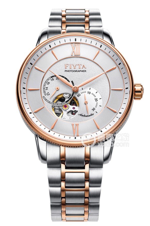 Basic Information ID: GA860003.MWM Brand: Fiyta Series: Photographer Movement Type: Automatic Mechanical Gender: Men’s Movement Type: Automatic Mechanical Appearance: Case Diameter: 42mm Case Thickness: 11.25mm Dial Color: Silver, Skeletonized Dial Shape: Round Strap Color: Two-tone Clasp Type: Push-button Double Clasp Case Back: Transparent Case Back, Screw-down Transparent Case Back, Coated Sapphire Crystal Weight: Not Available Water Resistance: 50 meters Hour Marker Type: Tapered Hour Markers Clasp Spacing: Not Available Lug Spacing: Not Available Materials: Case Material: Stainless Steel Dial Material: Rose Gold Plated Copper Hands Bezel Material: Stainless Steel, IP Rose Gold Plated Crystal Material: Single-sided Anti-reflective Sapphire Crystal Crown Material: Stainless Steel, IP Rose Gold Plated; Strap Material: Stainless Steel, IP Rose Gold Plated; Two-tone Clasp Material: Stainless Steel, IP Rose Gold Plated Functions: Power Reserve Display