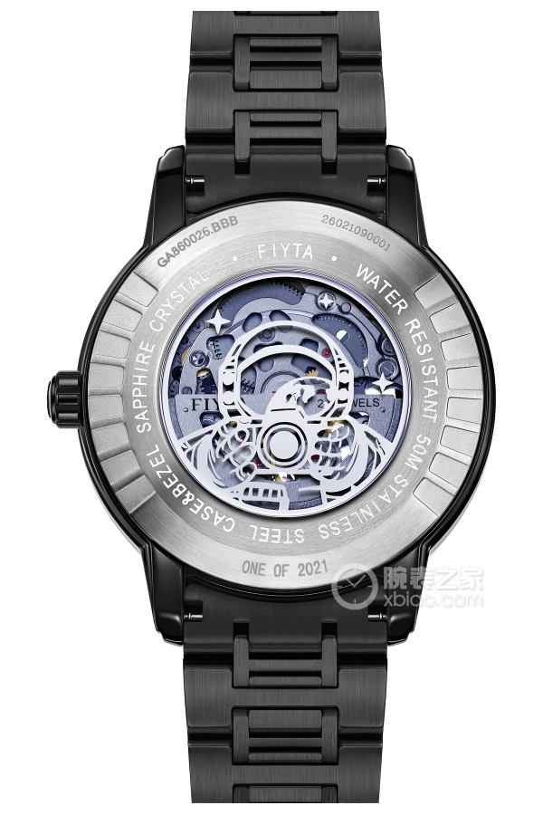 Basic Information ID: GA860026.BBB Brand: Fiyta Series: Photographer Movement Type: Automatic Mechanical Gender: Men’s Nickname: Space Photographer Limited Edition: 2021 Collaboration “Space Photographer” Limited Edition Movement: Automatic Mechanical Appearance: Case Diameter: 42mm Case Thickness: 11.6mm Dial Color: Skeletonized Dial Shape: Round Strap Color: Black Clasp Type: Push-button Double Clasp Case Back: Transparent Case Back; Engraved with Astronaut Handheld Camera Pattern Weight: Not Available Water Resistance: 50 Meters Hour Marker Type: Bat Markers Clasp Spacing: Not Available Lug Spacing: 20mm Material: Case Material: Stainless Steel Dial Material: Black, Large Skeletonized, Sandblasted; Bar Markers, 12 O’Clock Numeral; Luminous Bezel Material: Stainless Steel Crystal Material: Anti-reflective Synthetic Sapphire Crystal Crown Material: Black, Stainless Steel Strap Material: Black, Stainless Steel Clasp Material: Stainless Steel Functions: This watch has no other special functions.