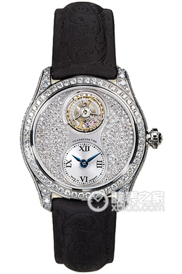 Basic Information ID 1-41-01-01-01-04 Brand: Glashütte Original Series Ladies’ Movement Type: Automatic Mechanical Gender: Unisex Movement Type: Automatic Mechanical Frequency: 21,600 vibrations per hour Jewels: 35 Power Reserve: 48 hours Appearance: Case Diameter: 36 mm Case Thickness: 10.6 mm Dial Color: Diamond-set Dial Shape: Round Strap Color: Black Clasp Type: Pin Buckle Case Back: Transparent Weight: Not available Water Resistance: 150 meters Hour Markers: None Clasp Spacing: Not available Lug Spacing: Not available Materials: Case Material: 18k White Gold Dial Material: Not available Bezel Material: Not available Crystal Material: Sapphire Crystal Crown Material: 18k White Gold Strap Material: Not available Clasp Material: 18k White Gold Functions: Tourbillon
