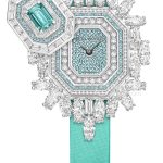 18k white gold, set with 192 round brilliant-cut diamonds, 38 baguette-cut diamonds, 24 marquise-cut diamonds, and 1 emerald-cut diamond.