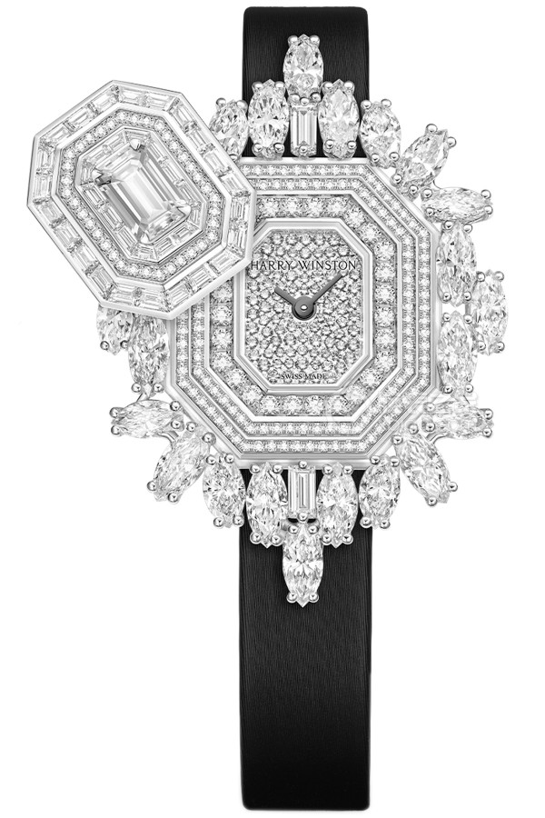 Harry Winston High Jewelry Watch HJTQHM32WW001 Quartz, 18k white gold, set with 192 round brilliant-cut diamonds, 38 baguette-cut diamonds, 24 marquise-cut diamonds, and 1 emerald-cut diamond, 32 x 46mm
