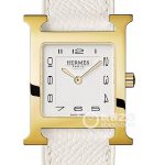 Basic Information ID: W036786WW00 Brand: Hermes Series: HEURE H Movement Type: Quartz Gender: Women’s Movement Type: Quartz Case Diameter: 26 x 26 mm Case Thickness: Not Available Dial Color: White Dial Shape: Square Strap Color: Orange Clasp Type: Pin Buckle Case Back: Solid Weight: Not Available Water Resistance: 30 meters Hour Markers: Arabic numerals Clasp Spacing: Not Available Lug Spacing: Not Available Materials: Case Material: Stainless Steel Dial Material: Sunburst Pattern Bezel Material: Gold-Plated Stainless Steel Crystal Material: Anti-Reflective Sapphire Crystal Crown Material: Gold-Plated Stainless Steel Strap Material: Calfskin Leather Clasp Material: Gold-Plated Stainless Steel Functions: This watch has no other special functions.