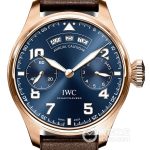 Basic Information: ID: IW502641; Brand: IWC; Series: Pilot’s Watch; Movement Type: Automatic; Gender: Men’s; Movement Model: Cal. 51614; Manufacturer: IWC; Movement Diameter: 37.8 mm; Movement Thickness: 8.8 mm; Frequency: 21,600 vibrations per hour; Hairspring: Breguet; Jewels: 62; Power Reserve: 168 hours; Case Diameter: 46.2 mm; Case Thickness: Not available; Dial Color: Blue; Dial Shape: Round; Strap Color: Black; Clasp Type: Folding Clasp; Case Back: Transparent; Weight: Not available; Water Resistance: 60 meters; Hour Markers: Arabic numerals, luminous; Clasp Spacing: Not available; Lug Spacing: Not available; Materials: Case Material: Stainless Steel; Dial Material: Not available; Bezel Material: Not available; Crystal Material: Sapphire Crystal; Crown Material: Not available; Strap Material: Calfskin; Clasp Material: Stainless Steel; Functions: Date Display, Day Display, Month Display, Annual Calendar, Perpetual Calendar, Moon Phase