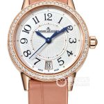 Basic Information ID: 3462490 Brand: Jaeger-LeCoultre Rendez-Vous Movement Type: Automatic Gender: Ladies Movement Model: 967A Movement Type: Automatic Manufacturer: Jaeger-LeCoultre Movement Thickness: 4.05 mm Frequency: 28,800 vibrations per hour Jewels: 28 Parts: 203 Power Reserve: 42 hours Exterior: Case Diameter: 29 mm Case Thickness: Not available Dial Color: White Dial Shape: Round Strap Color: Light Pink Buckle Type: Pin Buckle Case Back: Transparent Weight: Not available Water Resistance: 30 meters Hour Markers: Arabic numerals Clasp Spacing: Not available Lug Spacing: Not available Materials: Case Material: 18k rose gold Dial Material: Mother-of-pearl, black printed numerals, floral hands, set with 11 diamonds (0.02ct.), FG, VVS Bezel Material: 18k rose gold Crystal Material: Sapphire crystal Crown Material: 18k rose gold Strap Material: Leather Buckle Material: 18k rose gold Functions: This watch has no other special functions.