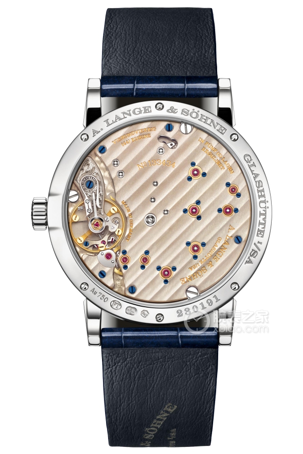 Basic Information: Model Number 182.086 / LS1823AX; Brand: Lange; Series: LANGE 1; Gender: Ladies; Movement: L121.2 Manufacturer: A. Lange & Söhne; Movement: 30.6 mm diameter, 5.7 mm thickness; Balance wheel: Shock-resistant balance wheel with off-center weights; Frequency: 21,600 vibrations per hour; Hairspring: In-house balance wheel; Jewels: 44; Parts: 411; Power reserve: 72 hours. Exterior: Case diameter: 36.8 mm; Case thickness: 10 mm; Dial color: Blue; Dial shape: Round; Strap color: Dark blue; Buckle type: Pin buckle; Case back: Transparent; Weight: 79.68 grams; Water resistance: 30 meters; Hour markers: Roman numerals; Clasp spacing: Not available; Lug spacing: 19 mm; Materials: Case material: 18k white gold; Dial material: Dark blue aventurine glass; Bezel material: 18k white gold; Crystal material: Sapphire crystal glass; Crown material: 18k white gold; Strap material: Alligator leather with a sparkling effect; Buckle material: 18k white gold; Functions: Large date, moon phase, power reserve display. Thanks to the helpful netizens Sparktang and XB_YFlpdqjt for correcting the product parameters.