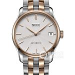 Basic Information ID: M024.407.22.033.00 Brand: Mido Series: Bruner Movement Type: Automatic Mechanical Gender: Men’s Movement Model: Caliber 80 Movement Type: Automatic Mechanical Manufacturer: ETA Base Movement: ETA C07.821 Movement Diameter: 25.6 mm Movement Thickness: 5.22 mm Balance Wheel: Free-sprung Balance Wheel Frequency: 21,600 vibrations per hour Hairspring: Silicon Hairspring Shock Protection: Triangular Shock Protection Jewels: 25 Power Reserve: 80 hours Exterior Case Diameter: 40 mm Case Thickness: 11.01 mm Dial Color: Silver Dial Shape: Round Strap Color: Two-tone Clasp Type: Folding Clasp Case Back: Transparent Weight: Not available Water Resistance: 50 meters Hour Marker Type: Bat Hour Markers Clasp Spacing: Not available Lug Spacing: 20 mm Materials: Case material: PVD (Physical Vapor Deposition) coating; Dial material: Roman numerals; Bezel material: PVD (Physical Vapor Deposition) coating; Crystal material: Double-sided anti-reflective sapphire crystal; Crown material: Stainless steel with PVD coating; Strap material: PVD-plated rose gold stainless steel; Two-tone stainless steel; Buckle material: Stainless steel with PVD coating; Functions: Date display