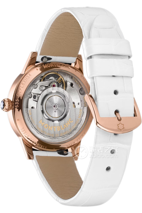 Basic Information ID: 129773 Brand: Montblanc Series: Bohème Movement Type: Automatic Gender: Ladies Movement Model: MB 24.20 Movement Type: Automatic Manufacturer: Montblanc Balance Wheel: Flat, Circular Frequency: 28,800 vibrations per hour Hairspring: Flat Number of Jewels: 25 Power Reserve: 56 hours Exterior: Case Diameter: 30 mm Case Thickness: 9.7 mm Dial Color: White Dial Shape: Round Strap Color: White Clasp Type: Pin Buckle Case Back: Transparent Weight: 100g Water Resistance: 30 meters Hour Markers: Diamond-set Hour Marker Spacing: Not available Lug Spacing: 14 mm Materials: Case: 18k rose gold; Dial: Mother-of-pearl dial with rose gold Arabic numerals and diamond hour markers, rose gold dotted minute markers, blue guilloché day/night indicator window adorned with silver stars and moon, rose gold hour, minute, and second hands; Bezel: 18k rose gold; Crystal: Domed sapphire crystal glass, scratch-resistant, double anti-reflective coating; Crown: 18k rose gold; Strap: Leather; Buckle: 18k rose gold; Functions: Date display