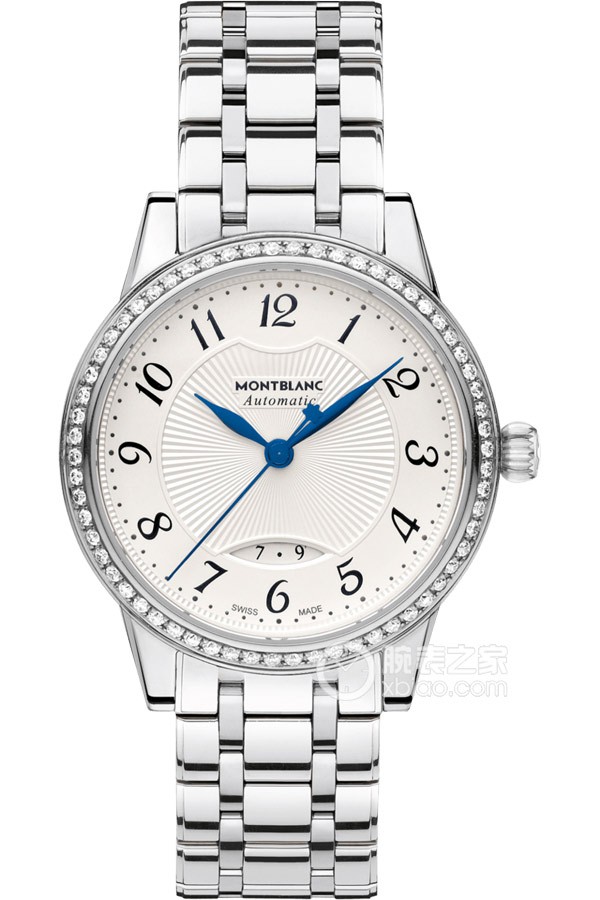 Basic Information Number U0111214 Brand Montblanc Series Bohème Movement Type Automatic Mechanical Gender Ladies’ Movement Movement Model MB 24.14 Movement Type Automatic Mechanical Manufacturer Montblanc Frequency 28,800 vibrations per hour Number of jewels 25 Power Reserve 38 hours Appearance Case Diameter: 30 mm Case Thickness: 9.5 mm Dial Color: Silver-white Dial Shape: Round Strap Color: Silver Clasp Type: Triple Folding Clasp Case Back: Transparent Weight: Not available Water Resistance: 30 meters Hour Marker Type: Arabic numerals Clasp Spacing: Not available Lug Spacing: Not available Materials Case Material: Stainless Steel Dial Material: Not available Bezel Material: Stainless Steel with 62 top-grade Serviton diamonds Crystal Material: Domed Sapphire Crystal Crown Material: Stainless Steel Strap Material: Stainless Steel Clasp Material: Stainless Steel Functions: Date Display