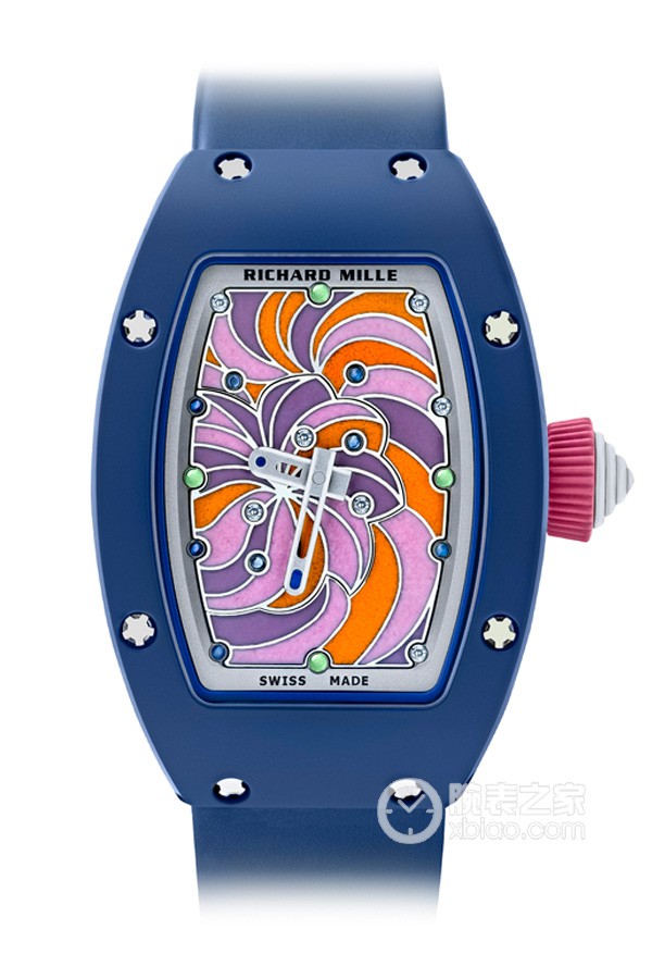 Basic Information: Model Number RM 07-03; Brand: Richard Mille; Series: Ladies; Movement Type: Automatic Mechanical; Gender: Ladies; Limited Edition: 30; Movement: CRMA2; Movement Type: Automatic Mechanical; Manufacturer: Unknown; Movement Diameter: 29.90 x 22.00 mm; Movement Thickness: 4.92 mm; Balance Wheel: Four-arm beryllium bronze alloy balance wheel with 4 adjusting screws; Instantaneous Inertia: 7.5 mg•cm²; Lift Angle: 50º°; Frequency: 28,800 vibrations per hour; Hairspring: AK3; Jewels: 25; Power Reserve: 50 hours; Case Diameter: 45.32 x 32.30 mm Case thickness: 11.93 mm Dial color: Patterned Dial shape: Tonneau Strap color: Blue Buckle type: Pin buckle Case back: Transparent Weight: Not available Water resistance: 50 meters Hour marker type: Round Hour markers Buckle spacing: Not available Lug spacing: Not available Materials Case material: Ceramic Dial material: Grade 5 titanium and white gold, hand-enamelted, set with sky blue sapphire, tsavorite, and diamonds Bezel material: Ceramic Crystal material: Sapphire crystal (Vickers hardness 1,800), double anti-reflective coating, 0.95 mm thick in the center, 1.67 mm thick around the perimeter Crown material: Not available Strap material: Rubber Buckle material: Ceramic Functions: This watch has no other special functions.