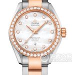 Basic Information ID: 231.20.39.21.55.004 Brand: Omega Series: Seamaster Movement Type: Automatic Mechanical Gender: Ladies’ Movement Model: 8500 Movement Type: Automatic Mechanical Manufacturer: Omega Balance Wheel: Free-sprung Balance Spring Frequency: 25,200 vibrations per hour Power Reserve: 60 hours Technical Certifications: Swiss Official Chronometer Testing Institute (COSC) Appearance: Case Diameter: 38.5 mm Case Thickness: Not Available Dial Color: White Dial Shape: Round Strap Color: Two-tone Clasp Type: Folding Clasp Case Back: Transparent Weight: Not Available Water Resistance: 150 meters Hour Markers: Diamond-set Hour Markers Clasp Spacing: Not Available Lug Spacing: 19 mm Materials: Case Material: Stainless Steel Dial Material: Diamond-set White Mother-of-Pearl Bezel Material: 18k Gold Crystal Material: Domed Double-sided Anti-reflective Sapphire Crystal Crown Material: 18k Gold, Screw-down Crown Strap Material: Stainless Steel/18k Gold; Two-tone Clasp Material: Stainless Steel Functions: Date Display, Antimagnetic