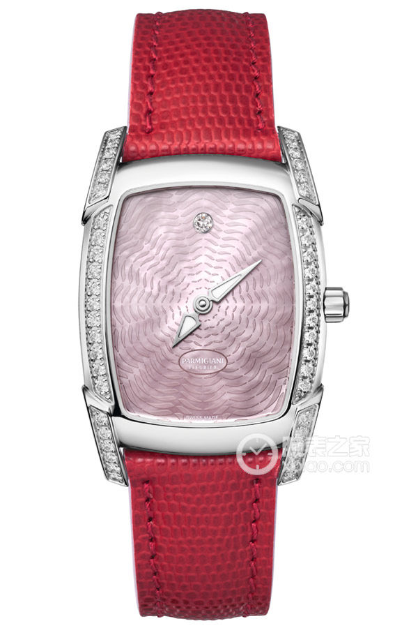 Basic Information Number: PFC186-0022000-XC2122 Brand: Parmigiani Fleurier Series Movement Type: Quartz Gender: Women’s Limited Edition: 96 Movement Model: PF601 Movement Type: Quartz Manufacturer: Parmigiani Fleurier Appearance: Case Diameter: 29.5 x 24.5 mm Case Thickness: 6.9 mm Dial Color: Magenta Dial Shape: Tonneau Strap Color: Red Clasp Type: Folding Clasp Case Back: Solid Weight: Not Available Water Resistance: 30 meters Hour Markers: None Hour Marker Spacing: Not Available Lug Spacing: Not Available Materials: Case Material: Stainless steel, set with 46 diamonds weighing 0.4250 carats Dial Material: Mother-of-pearl; triangular wing-shaped luminescent material Hands Bezel Material: Not Available Crystal Material: Anti-reflective sapphire Crystal Crown Material: Triangular wing-shaped luminescent material Strap Material: Calfskin Clasp Material: Stainless steel Functions: This watch has no other special functions.