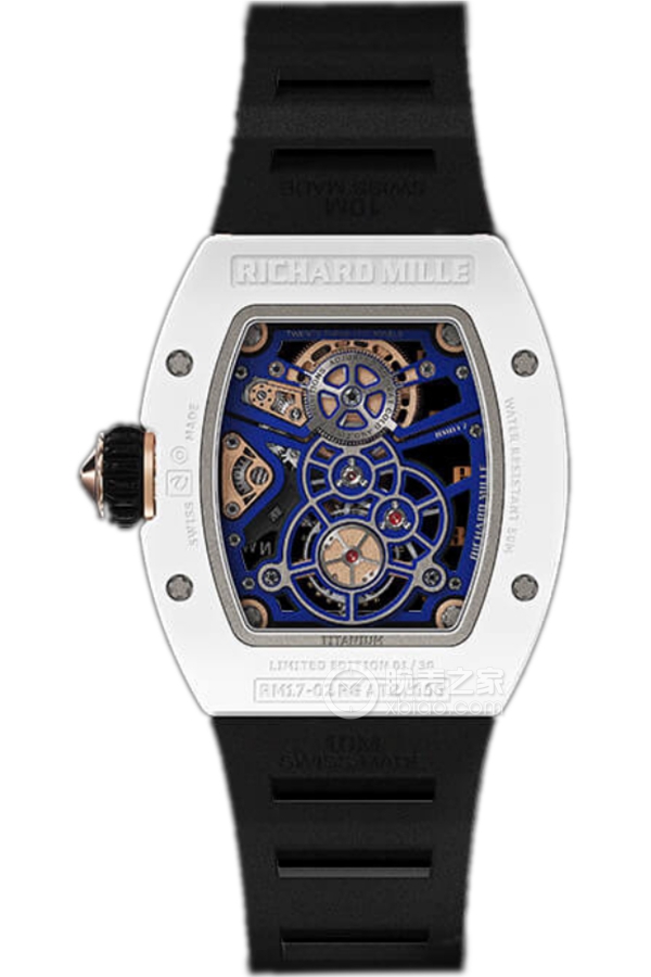 Basic Information: Model Number RM17-02BLACK; Brand: Richard Mille Series; Men’s Watch; Movement Type: Manual Winding; Gender: Men; Movement Model: RM17-02; Movement Type: Manual Winding; Manufacturer: Unknown; Movement Diameter: 31.20 x 29.45 mm; Movement Thickness: 4.65 mm; Balance Wheel: 10.00 mm, two-arm beryllium bronze alloy (Glucydur®), 4 adjusting screws; Instantaneous Inertia: 10 mg.cm²; Lift Angle: 53°; Frequency: 21600 rpm; Hairspring: Nivarox® Elinvar alloy; Shock Absorber: KIF Elastor KE 160 B28 70-hour power reserve; Case diameter: Not available; Case thickness: Not available; Dial color: Skeletonized; Dial shape: Skeletonized; Strap color: Black; Clasp type: Folding clasp; Case back: Transparent; Weight: Not available; Water resistance: 50 meters; Hour marker type: Other; Clasp spacing: Not available; Lug spacing: Not available; Materials: Case material: Ceramic-rose gold, triple-layer case with two nitrile rubber O-rings, assembled with 12 grade 5 titanium spline screws and 316L stainless steel anti-wear washers; Dial material: Not available; Bezel material: Ceramic; Crystal material: Sapphire crystal; Crown material: Ceramic, rose gold; Strap material: Rubber; Clasp material: 18k rose gold; Functions: Tourbillon.
