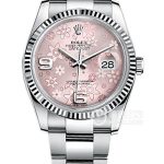 Basic Information: ID 116234 Pink Floral Dial Commemorative Watch Strap; Brand: Rolex; Series: Datejust; Movement Type: Automatic; Gender: Pink; Movement Model: 3135; Movement Type: Automatic; Manufacturer: Rolex; Hairspring: Parachrom (blue); Power Reserve: 48 hours; Technical Certifications: Superlative Chronometer Certification; Appearance: Case Diameter: 36mm; Case Thickness: 12mm; Dial Color: Pink; Dial Shape: Round; Strap Color: Silver; Clasp Type: Folding Clasp; Case Back: Solid; Weight: Not Available; Water Resistance: 100 meters; Hour Markers: Arabic numerals; Clasp Spacing: Not Available; Lug Spacing: Not Available; Materials: Case Material: Stainless Steel/18k White Gold; Dial Material: Pink Floral Dial; Bezel Material: Knurled Bezel; Crystal Material: Sapphire Crystal; Crown Material: Standard; Strap Material: Stainless Steel; Commemorative, Five-Link Clasp Material: Stainless Steel/18k White Gold; Functions: Date Display