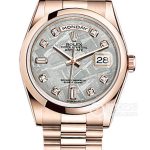 Basic Information: Model No. 118205 (Chocolate Dial); Brand: Rolex; Series: Day-Date; Movement Type: Automatic; Gender: Men’s; Movement Model: 3155; Movement Type: Automatic; Manufacturer: Omega; Technical Certification: Superlative Chronometer; Appearance: Case Diameter: 36mm; Case Thickness: Not Available; Dial Color: Chocolate; Dial Shape: Round; Strap Color: Gold; Clasp Type: Crown Buckle; Case Back: Solid; Weight: Not Available; Water Resistance: 100 meters; Hour Marker Type: Bat; Luminous; Clasp Spacing: Not Available; Lug Spacing: Not Available; Materials: Case Material: 18k Rose Gold; Dial Material: Not Available; Bezel Material: 18k Rose Gold; Crystal Material: Sapphire Crystal; Crown Material: 18k Rose Gold; Strap Material: 18k Rose Gold; Oyster, Three-Link Clasp Material: 18k Rose Gold; Functions: Date Display, Day Display