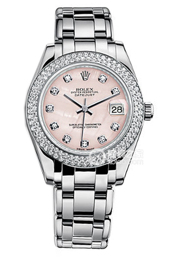 Basic Information No. 81339 Pink Mother-of-Pearl Diamond Set Brand Rolex Series Lady-Datejust Movement Type Automatic Mechanical Gender Ladies Movement Model Cal. 2235 Movement Type Automatic Mechanical Manufacturer Rolex Movement Diameter 20mm Movement Thickness 5.95mm Frequency 28,800 vibrations per hour Hairspring Parachrom Shock-resistant Paraflex Jewels 31 Power Reserve 48 hours Technical Certifications Superlative Chronometer Certification Appearance Case Diameter: 34mm Case Thickness: 12mm Dial Color: Pink Dial Shape: Round Strap Color: Silver Clasp Type: Folding Clasp Case Back: Solid Case Back Weight: Not Available Water Resistance: 100 meters Hour Marker Type: Diamond Hour Markers Clasp Spacing: Not Available Lug Spacing: Not Available Materials Case Material 18k White Gold Dial Material Mother-of-Pearl Diamond Set Bezel Material 18k White Gold Diamond Set Crystal Material Sapphire Crystal Glass Crown Material 18k White Gold Strap Material 18k White Gold Clasp Material 18k White Gold Functions Date Display