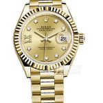 Basic Information Number: m279175-0004; Brand: Rolex; Series: Women’s Datejust; Movement Type: Automatic Mechanical; Gender: Women’s; Movement Model: 2236 Movement Type: Automatic Mechanical; Manufacturer: Rolex; Power Reserve: 55 Hours; Technical Certification: Swiss Observatory Certification, Superlative Chronometer; Appearance: Case Diameter: 28mm; Case Thickness: Not Available; Dial Color: Chocolate, Diamond Set; Dial Shape: Round; Strap Color: Gold; Clasp Type: Concealed Folding Crown Buckle; Case Back: Solid Case Back, Rolex Fluted Screw-Down Case Back; Weight: Not Available; Water Resistance: 100 Meters; Hour Markers: Diamond Set; Clasp Spacing: Not Available; Lug Spacing: Not Available; Materials: Case Material: 18k Rose Gold; Dial Material: Not Available; Bezel Material: 18k Rose Gold, Fluted Bezel; Crystal Material: Scratch-Resistant Sapphire Crystal, Double Anti-Reflective Lens; Date Window: Cyclops Lens; Crown Material: Screw-Down Twin Lock, Double Water Resistant Crown; Strap Material: 18k Rose Gold (Jubilee), Five-Link Clasp Material: 18k Rose Gold; Functions: Date Display