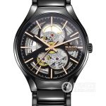 Polished black PVD-coated stainless steel, with polished 18K 5N rose gold lugs and case material.