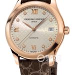Basic Information Number: 60875065 Brand: Tiffany & Co. Series: TIFFANY METRO Movement Type: Automatic Mechanical Gender: Ladies Movement Type: Automatic Mechanical Power Reserve: 42 hours Appearance: Case Diameter: 34 mm Case Thickness: Not Available Dial Color: White Dial Shape: Round Strap Color: Brown Clasp Type: Not Available Case Back: Not Available Weight: Not Available Water Resistance: 50 meters Hour Markers: Diamond-set Hour Markers Clasp Spacing: Not Available Lug Spacing: Not Available Materials: Case Material: 18k rose gold, set with round brilliant-cut diamonds Dial Material: White lacquered dial with transparent enamel finish, sky blue seconds hand and 18k rose gold brushed minute markers, set with 8 round-cut and 3 trapezoidal-cut diamonds Hour Markers: Bezel Material: Not Available Crystal Material: Sapphire Crystal Crown Material: 18k rose gold crown set with a uniquely serial numbered Tiffany diamond Strap Material: Alligator Leather Clasp Material: Not Available Functions: This watch has no other special functions.