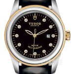 Tudor Grandeur 53003 – White dial with diamonds, gold bezel, and white patent leather strap Automatic machinery, stainless steel, 31mm