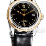 Tudor Grandeur 55003: White dial with diamonds, gold bezel, and black genuine leather strap. Automatic machinery, stainless steel, 36mm