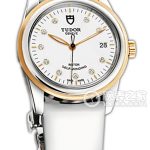 Tudor Jade 55003-LS with gold jacquard dial, gold bezel, and white lizard leather strap Automatic machinery, precision steel, 36mm