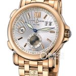 Basic Information ID: 246-55-8/30 Brand: Ulysse Nardin Movement Type: Automatic Mechanical Gender: Men’s Movement Model: UN-24 Manufacturer: Ulysse Nardin Appearance: Case Diameter: 42mm Case Thickness: 12mm Dial Color: Gold Dial Shape: Round Strap Color: Gold Clasp Type: Folding Clasp Case Back: Not Available Weight: Not Available Water Resistance: 100 meters Hour Marker Type: Bat Hour Markers Clasp Spacing: Not Available Lug Spacing: Not Available Materials: Case Material: 18k Rose Gold Dial Material: Not Available Bezel Material: 18k Rose Gold Crystal Material: Sapphire Crystal Crown Material: 18k Rose Gold Strap Material: 18k Rose Gold Clasp Material: 18k Rose Gold Functions: Date Display, Dual Time Zone