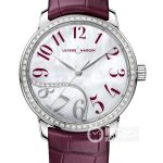 Basic Information Number: 8153-201/60-03 Brand: Ulysse Nardin Series: Gilded Movement Type: Automatic Mechanical Gender: Ladies Movement Model: UN-815 Movement Type: Automatic Mechanical Manufacturer: Ulysse Nardin Power Reserve: 42 hours Appearance: Case Diameter: 37mm Case Thickness: Not Available Dial Color: White Dial Shape: Round Strap Color: Dark Blue Clasp Type: Folding Clasp Case Back: Engraved Case Back Weight: Not Available Water Resistance: 30 meters Hour Marker Type: Arabic Numerals Clasp Spacing: Not Available Lug Spacing: Not Available Materials: Case Material: Stainless Steel Dial Material: White mother-of-pearl and diamond dial with blue Arabic numeral hour markers, set with 10 diamonds totaling 0.052 carats Bezel Material: Stainless Steel Crystal Material: Anti-reflective and scratch-resistant sapphire crystal Crown Material: Stainless Steel Strap Material: Genuine leather Clasp Material: Stainless steel Functions: This watch has no other special functions.