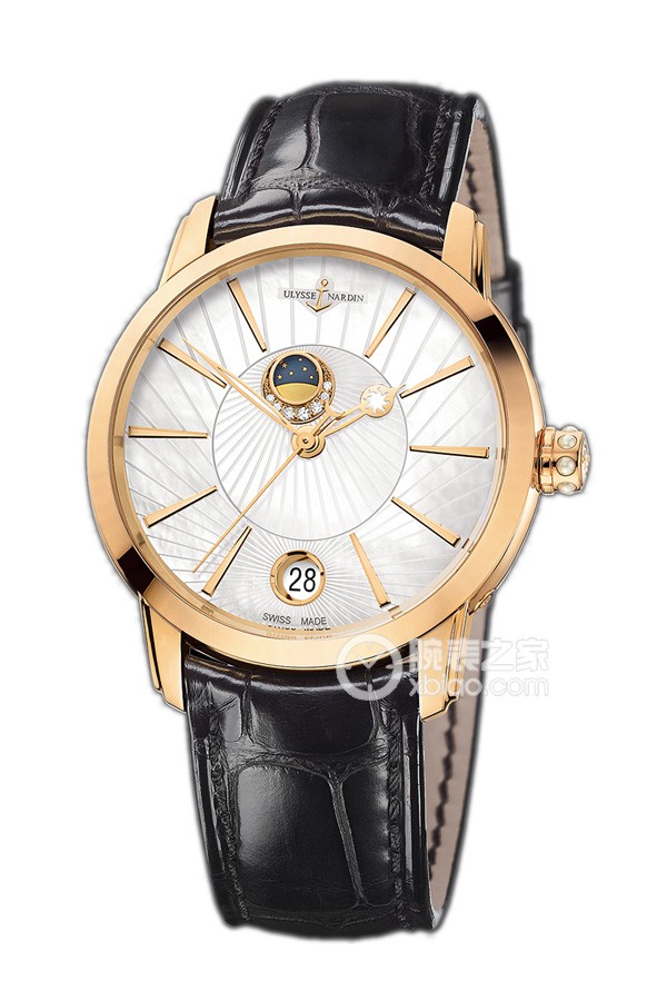 Basic Information ID: 8296-123-2/91 Brand: Ulysse Nardin Series: Gold-plated Movement Type: Automatic Mechanical Gender: Ladies’ Movement: UN-829 Movement Type: Automatic Mechanical Manufacturer: Ulysse Nardin Appearance: Case Diameter: 35mm Case Thickness: Not Available Dial Color: White Dial Shape: Round Strap Color: Black Clasp Type: Not Available Case Back: Not Available Weight: Not Available Water Resistance: 50 meters Hour Marker Type: Not Available Clasp Spacing: Not Available Lug Spacing: Not Available Materials: Case Material: 18k Rose Gold Dial Material: Mother-of-Pearl Dial with 7 Diamonds Bezel Material: Not Available Crystal Material: Sapphire Crystal Crown Material: 18k Rose Gold with Diamonds Strap Material: Leather Clasp Material: 18k Rose Gold Functions: Date Display, Moon Phase