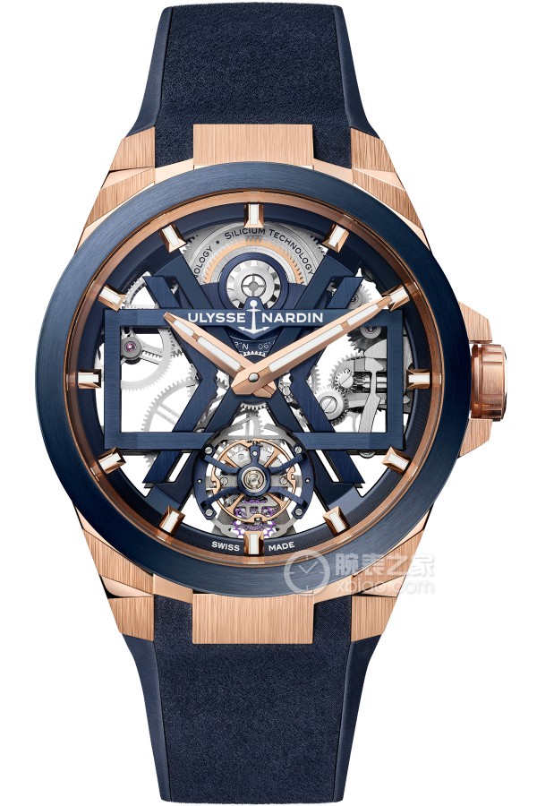 Basic Information: ID: 1725-400-3A/3A; Brand: Ulysse Nardin; Series: BLAST; Movement Type: Automatic; Gender: Men’s; Movement Model: UN-172; Manufacturer: Ulysse Nardin; Frequency: 18,800 vibrations per hour; Jewels: 25; Parts: 137; Power Reserve: 72 hours; Appearance: Case Diameter: 45mm; Case Thickness: Not available; Dial Color: Skeletonized; Dial Shape: Skeletonized; Strap Color: Blue; Clasp Type: Folding Clasp; Case Back: Transparent; Weight: Not available; Water Resistance: 50 meters; Hour Marker Type: Bat; Clasp Spacing: Not available; Lug Spacing: Not available; Materials: Case Material: 5N Rose Gold; Dial Material: Blue rectangular bezel with double “X” frame; Gold-plated hour markers and hands with SuperLuminova luminous coating; Bezel Material: Titanium; Crystal Material: Sapphire Crystal; Crown Material: 5N Rose Gold; Strap Material: Rubber; Clasp Material: Titanium/5N Rose Gold; Function: Tourbillon