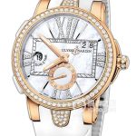 Basic Information ID: 246-10-3/30-05 Brand: Ulysse Nardin Series: BLAST Movement Type: Automatic Mechanical Gender: Ladies Movement Model: UN-24 Manufacturer: Ulysse Nardin Appearance: Case Diameter: 40mm Case Thickness: Not Available Dial Color: Coffee Dial Shape: Round Strap Color: White Clasp Type: Folding Clasp Case Back: Transparent Weight: Not Available Water Resistance: 50 meters Hour Markers: Roman Numerals Clasp Spacing: Not Available Lug Spacing: Not Available Materials: Case Material: 18k Rose Gold/Ceramic Dial Material: Central White Mother-of-Pearl with Brown Sunburst Bezel Material: Not Available Crystal Material: Sapphire Crystal Glass Crown Material: 18k Rose Gold with Diamonds Strap Material: Rubber/Ceramic Clasp Material: 18k Rose Gold Functions: Large Date, Dual Time Zone