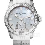 Basic Information ID: 3203-190-3C/10.10 Brand: Ulysse Nardin Series: Diving Movement Type: Automatic Mechanical Gender: Ladies’ Movement: UN-320 Movement Type: Automatic Mechanical Manufacturer: Ulysse Nardin Technical Certification: Swiss Official Chronometer Testing Institute (COSC) Appearance: Case Diameter: 40mm Case Thickness: Not Available Dial Color: White Dial Shape: Round Strap Color: White Clasp Type: Folding Clasp Case Back: Not Available Weight: Not Available Water Resistance: 300 meters Hour Marker Type: Diamond-set Hour Markers Clasp Spacing: Not Available Lug Spacing: Not Available Materials: Case Material: Stainless Steel Dial Material: Mother-of-Pearl with 8 diamonds weighing 0.062 carats Bezel Material: Rubber White Unidirectional Rotating Bezel Crystal Material: Sapphire Crystal Glass Crown Material: Screw-down Safety Crown Strap Material: Rubber/Stainless Steel with 80 diamonds weighing 0.062 carats Clasp Material: Stainless Steel Functions: Date Display