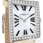Basic Information Number: 25562/000G-9170 Brand: Vacheron Constantin Series: Heritage Movement Type: Quartz Gender: Ladies Movement Model: Cal.1202 Movement Type: Quartz Manufacturer: Vacheron Constantin Movement Diameter: 13mm Movement Thickness: 2.1mm Frequency: 32,768 Hz Number of Jewels: 4 Number of Parts: 33 Case Diameter: 29mm Case Thickness: 6.3mm Dial Color: Silver-white Dial Shape: Round Strap Color: Black Clasp Type: Pin Buckle Case Back: Solid Weight: Not Available Water Resistance: 30 meters Hour Markers: Diamond-set Hour Markers, Roman Numerals Clasp Spacing: Not Available Lug Spacing: Not Available Materials: Case Material: 18k White Gold Dial Material: Mother-of-Pearl, 8 Hour Markers, Diamond-set Bezel Material: 18k White Gold, Diamond-set Crystal Material: Sapphire Crystal Crown Material: 18k White Gold Strap Material: Silk Strap Clasp Material: 18k White Gold Functions: This watch has no other special functions.