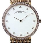 Basic Information Number 25562/000R-9183 Brand: Vacheron Constantin Series: Patrimony Movement Type: Quartz Gender: Ladies Movement Model: Cal.1202 Movement Type: Quartz Manufacturer: Vacheron Constantin Movement Diameter: 13mm Movement Thickness: 2.1mm Frequency: 32,768 oscillations per hour Jewels: 4 Number of Parts: 33 Case Diameter: 29mm Case Thickness: 6.3mm Dial Color: Beige Dial Shape: Round Strap Color: Beige Clasp Type: Pin Buckle Case Back: Solid Weight: Not available Water Resistance: 30 meters Hour Markers: Diamond-set Roman numerals Clasp Spacing: Not available Lug Spacing: Not available Materials: Case Material: 18k rose gold Dial Material: Mother-of-pearl, 8 diamond-set hour markers Bezel Material: 18k rose gold Diamond-set Crystal Material: Sapphire crystal Crown Material: 18k rose gold Strap Material: Silk Strap Clasp Material: 18k rose gold Functions: This watch has no other special functions.