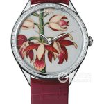 Basic Information: Product Number 82650/000G-9854; Brand: Vacheron Constantin; Series: Master of the Arts; Movement Type: Manual Mechanical; Gender: Women’s; Limited Edition: 5; Movement: Movement Model 4400; Movement Type: Manual Mechanical; Manufacturer: Vacheron Constantin; Movement Diameter: 28.6 mm; Movement Thickness: 2.8 mm; Frequency: 28,800 vibrations per hour; Number of Jewels: 21; Number of Parts: 127; Power Reserve: 65 hours; Functions: Geneva Seal Technical Certification: Geneva Seal Certification Appearance: Case Diameter: 37mm; Case Thickness: 8mm; Dial Color: Patterned; Dial Shape: Round; Strap Color: Brown; Buckle Type: Pin Buckle; Case Back: Transparent Sapphire Crystal; Weight: Not Available; Water Resistance: 30 meters; Hour Marker Type: None; Hour Marker Spacing: Not Available; Lug Spacing: Not Available; Materials: Case Material: 18k White Gold; Dial Material: Strelitzia Royal; Bezel Material: 18k White Gold; Diamond Set: 73 Diamonds, Approx. 1.81 Carats; Crystal Material: Sapphire Crystal; Crown Material: 18k White Gold; Strap Material: Mississippi Alligator Leather, Satin; Buckle Material: 18k White Gold; Functions: This watch has no other special functions.
