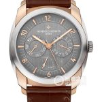 Basic Information: Product ID: 85050/000R-I0P2A; Brand: Vacheron Constantin; Series: Quadridley; Movement Type: Automatic; Gender: Men’s; Movement Model: 2475SC/1; Manufacturer: Vacheron Constantin; Movement Diameter: 26.20 mm; Movement Thickness: 5.70 mm; Frequency: 28,800 vibrations per hour; Number of Parts: 264; Power Reserve: 40 hours; Functions: Geneva Seal; Appearance: Case Diameter: 41 x 50.5 mm; Case Thickness: 12.9 mm; Dial Color: Silver-grey; Dial Shape: Round; Strap Color: Dark Brown; Clasp Type: Folding Clasp; Case Back: Transparent; Weight: Not Available; Water Resistance: 30 meters; Hour Marker Type: Bat; Hour Markers: Arabic numerals; Clasp Spacing: Not Available; Lug Spacing: Not Available; Materials: Case Material: 18k Rose Gold; Dial Material: Not Available; Bezel Material: 18k Rose Gold; Crystal Material: Sapphire Crystal; Crown Material: 18K 5N Pink gold strap material: alligator leather; buckle material: 18k rose gold; functions: date display, day of the week display.