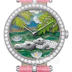 Basic Information ID: VCARN9V600 Brand: Van Cleef & Arpels Series: Exceptional Dial Movement Type: Automatic Mechanical Gender: Men’s Movement Type: Automatic Mechanical Appearance: Case Diameter: 45mm Case Thickness: Not Available Dial Color: Patterned Dial Shape: Round Strap Color: Black Clasp Type: Pin Buckle Case Back: Solid Weight: Not Available Water Resistance: 30 meters Hour Marker Type: None Hour Marker Spacing: Not Available Lug Spacing: Not Available Materials: Case Material: White Gold Dial Material: Yellow Gold Bezel Material: White Gold Crystal Material: Sapphire Crystal Glass Crown Material: White Gold Strap Material: Alligator Leather Clasp Material: White Gold Functions: This watch has no other special functions.