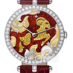 Basic Information Number: VCARO4I900; Brand: Van Cleef & Arpels; Series: Extraordinary Dial; Movement Type: Manual Mechanical; Gender: Women’s; Limited Edition: 22; Movement Model: Cal.830P Movement Type: Manual Mechanical; Manufacturer: Piaget; Movement Diameter: 26.8 mm; Balance Wheel Screw: Balance Wheel; Frequency: 21,600 rpm; Number of Jewels: 19; Number of Parts: 131; Power Reserve: 60 hours; Case Diameter: 38 mm; Case Thickness: Not Available; Dial Color: Patterned; Dial Shape: Round; Strap Color: Burgundy Red; Buckle Type: Pin Buckle; Case Back: Not Available; Weight: Not Available; Water Resistance: 30 meters; Hour Markers: Roman Numerals; Clasp Spacing: Not Available; Lug Spacing: Not Available; Materials: Case Material: 18k White Gold with Diamonds; Dial Material: Yellow Gold and White Gold, Yellow and White Diamonds, Translucent Enamel, Mother-of-Pearl; Bezel Material: 18k White Gold with Diamonds; Crystal Material: Sapphire Crystal; Crown Material: 18k White Gold with Diamonds; Strap Material: Alligator Leather; Buckle Material: 18k White Gold with Diamonds; Functions: This watch has no other special functions.